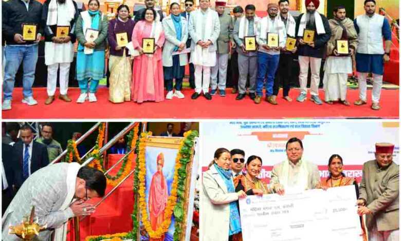 मुख्यमंत्री पुष्कर सिंह धामी ने सोमवार को राष्ट्रीय युवा दिवस के अवसर पर परेड ग्राउण्ड देहरादून में विभिन्न क्षेत्रों में सराहनीय कार्य करने वाले महिला मंगल दलों और युवक मंगल दलों को पुरस्कृत किया। प्रथम, द्वितीय और तृतीय पुरस्कार प्राप्त करने वाले मंगल दलों को क्रमशः 01 लाख, 50 हजार एवं 25 हजार रुपये की धनराशि प्रदान की गई। महिला मंगल दल धापला, नैनीताल को प्रथम, महिला मंगल दल सेमा, चमोली को द्वितीय तथा महिला मंगल दल बनाली, टिहरी गढ़वाल को तृतीय स्थान प्राप्त करने पर पुरस्कृत किया गया। जबकि युवक मंगल दल मोख मल्ला, चमोली को प्रथम, युवक मंगल दल सुंदरपुर रैक्वाल, नैनीताल को द्वितीय एवं युवक मंगल दल चौडीराय चम्पावत को तृतीय स्थान प्राप्त करने पर पुरस्कृत किया गया। इसके अलावा भाषण प्रतियोगिता के विजेताओं एवं एन.एस.एस. अवार्ड विजेता युवाओं को भी सम्मानित किया गया। इस अवसर पर एन.एस.एस. द्वारा मुख्यमंत्री राहत कोष के लिए 02 लाख 24 हजार 320 रुपये का चेक मुख्यमंत्री को सौंपा।