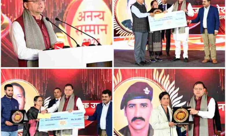 मुख्यमंत्री पुष्कर सिंह धामी ने शुक्रवार को सहस्त्रधारा रोड, स्थित एक होटल में उत्तराखंड अनन्य सम्मान कार्यक्रम में प्रतिभाग किया। इस दौरान मुख्यमंत्री ने शहीद सैनिकों के परिजनों को सम्मानित किया।