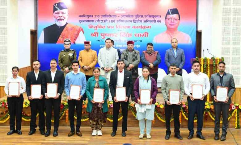 मुख्यमंत्री पुष्कर सिंह धामी ने बुधवार को मुख्यमंत्री कैम्प कार्यालय स्थित मुख्य सेवक सदन में 215 उपनिरीक्षकों को नियुक्ति पत्र प्रदान किये। जिसमें 104 उप-निरीक्षक, 88 गुल्मनायक (पी.ए.सी) एवं 23 अग्निशमन द्वितीय अधिकारी शामिल हैं।