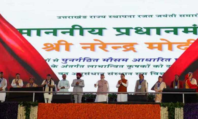 उत्तराखंड राज्य स्थापना दिवस, रजत जयंती पर्व के मुख्य समारोह में लिए रविवार को देहरादून पहुंचे प्रधानमंत्री नरेंद्र मोदी जी ने 8260 करोड़ रुपए की विकास परियोजनाओं का शिलान्यास – लोकार्पण किया। उन्होने उत्तराखंड की गत 25 वर्षों की उपलब्धियों की सराहना करते हुए, अगले 25 वर्षो के लिए रोडमैप के साथ आगे बढ़ने के लिए प्रेरित किया।